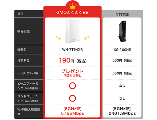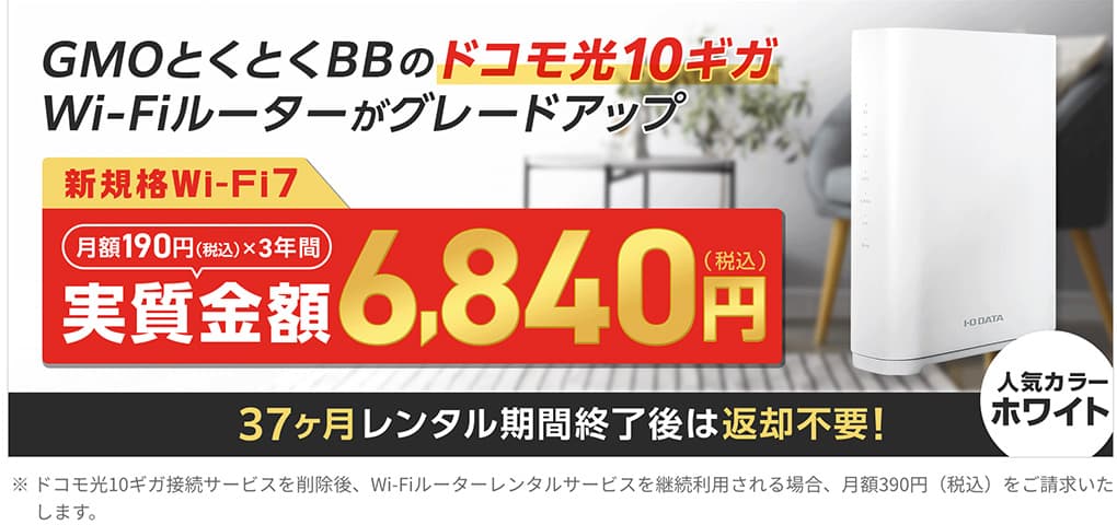 月額わずか190円(税込)。NTTの10ギガルーターレンタル(550円)より年間で4,320円も節約できます。・37ヶ月後には自分のものに